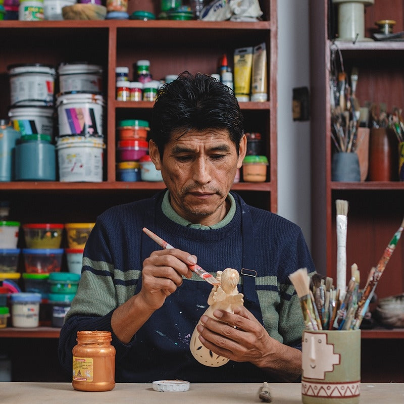 Antonio Oré, es el artista y artesano ayacuchano que impregna a estas piezas de su nostalgia por Ayacucho. Su visión única de la tierra que lo vio nacer. Un tributo a los retablos, a su tradición y a su historia.